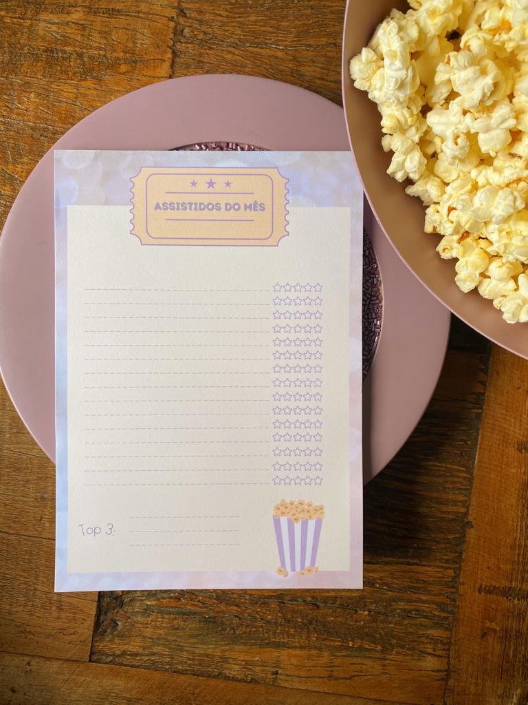 Se você ainda acha que organizar tudo isso online é muito confuso ou prefere complementar com alguma outra coisa, que tal recorrer ao papel? Você pode usar um caderno como movie journal, anotando séries e filmes que você for assistindo e títulos que você ainda quer assistir. E claro, também pode anotar seus assistidos mensais no Bloco Assistidos da LILAC. Nele, você registra tudo que viu naquele mês e ainda avalia quantas estrelas cada filme ou episódio merece.